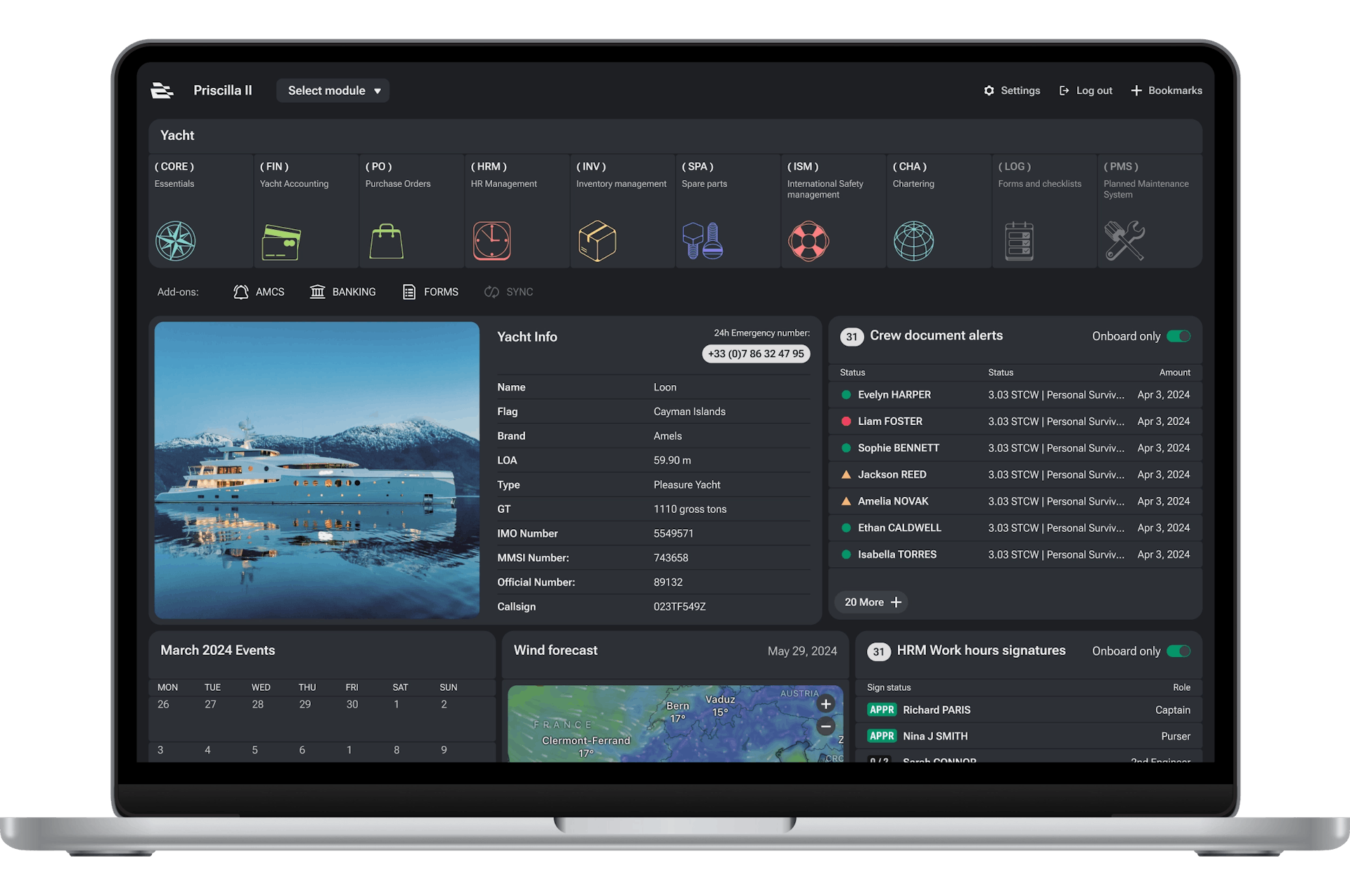 This starter module represents the core of DeepBlue yacht management features. It contains crucial contacts data (Crew/Guests/Staff), yacht documentation, granular permission settings and more. It serves as a central hub that makes all of its contents available to other modules. It eliminates data silos, ensuring a unified management experience. As we like to say: when in doubt, keep it simple.