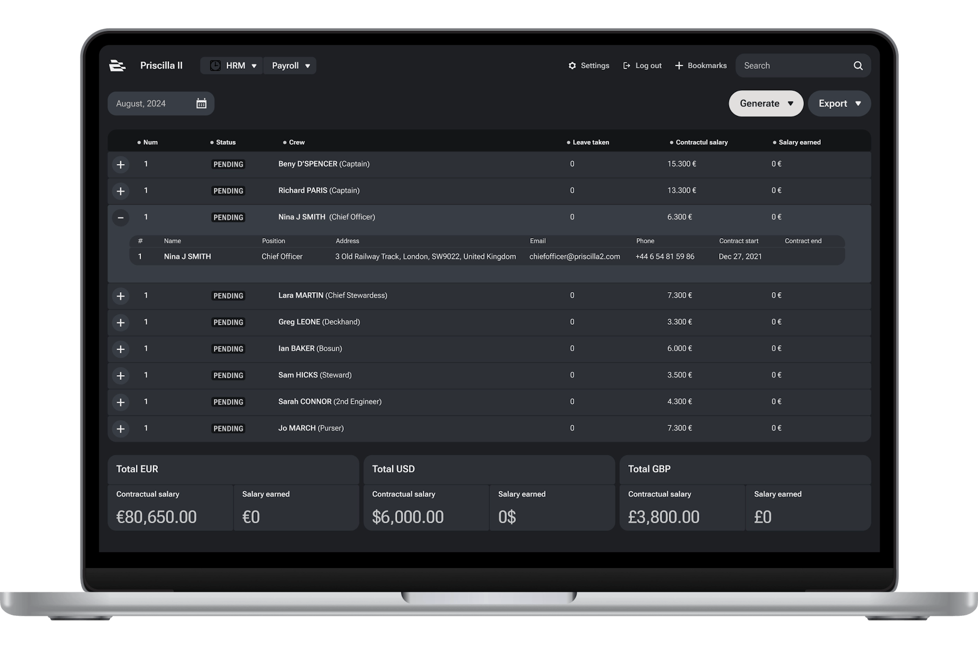 By streamlining essential yacht HRM tasks like scheduling, leave management, and payroll processing, this module not only guarantees compliance with maritime laws but also optimizes daily operations. It provides concrete solutions for managing work and rest hours, issuing accurate payrolls promptly, and efficiently handling leave requests, directly improving crew satisfaction and operational smoothness.