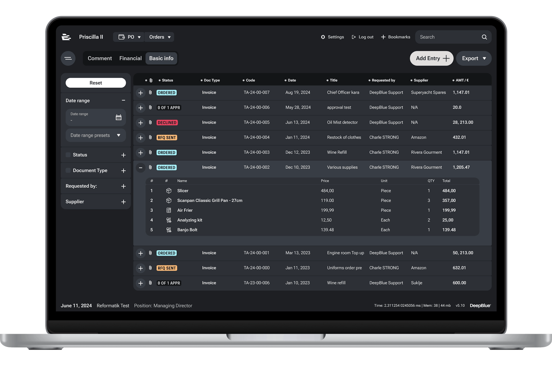 When upgraded with the Inventory and Spare Parts modules, our purchase order management software transforms into a comprehensive warehouse management tool, fully integrated with DeepBlue's existing modules to simplify and enhance the procurement process.